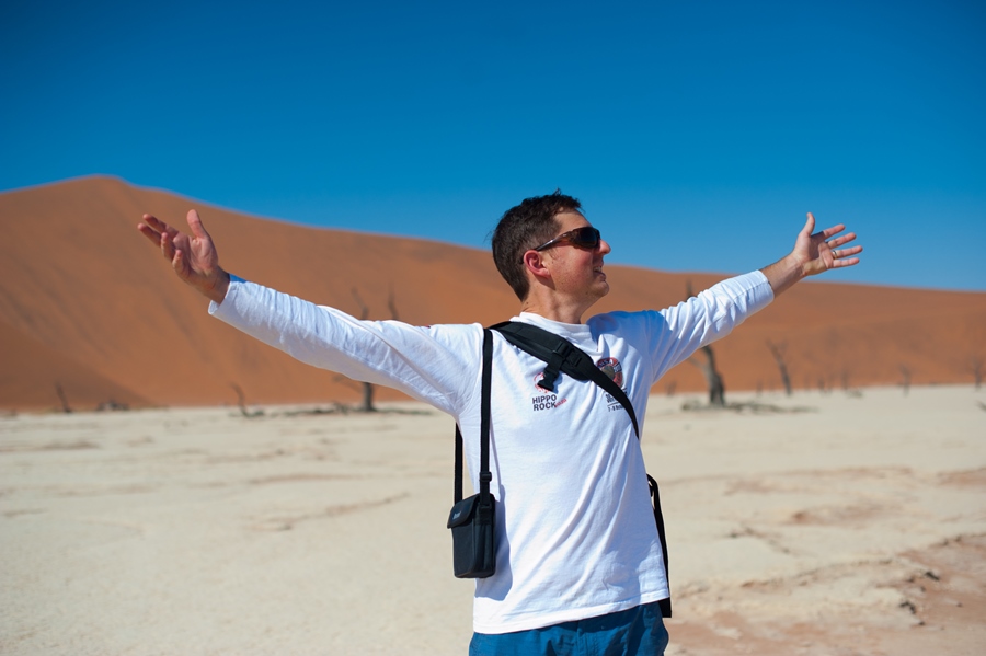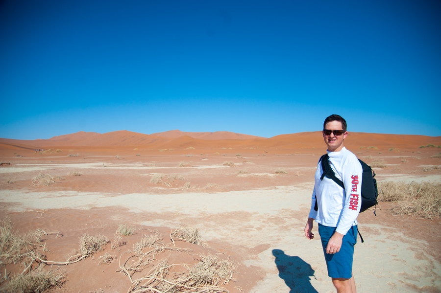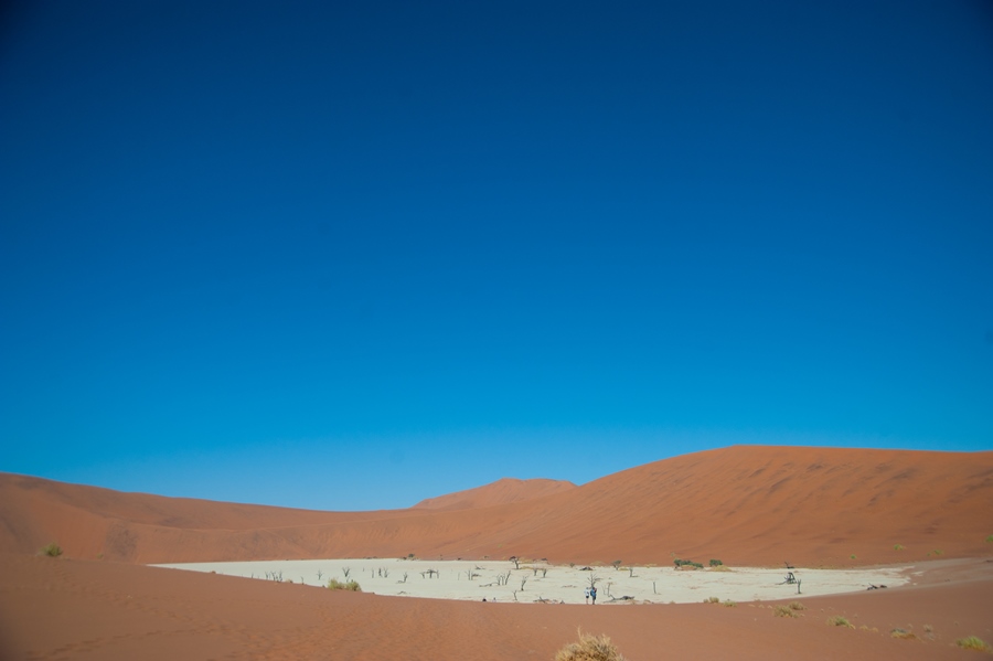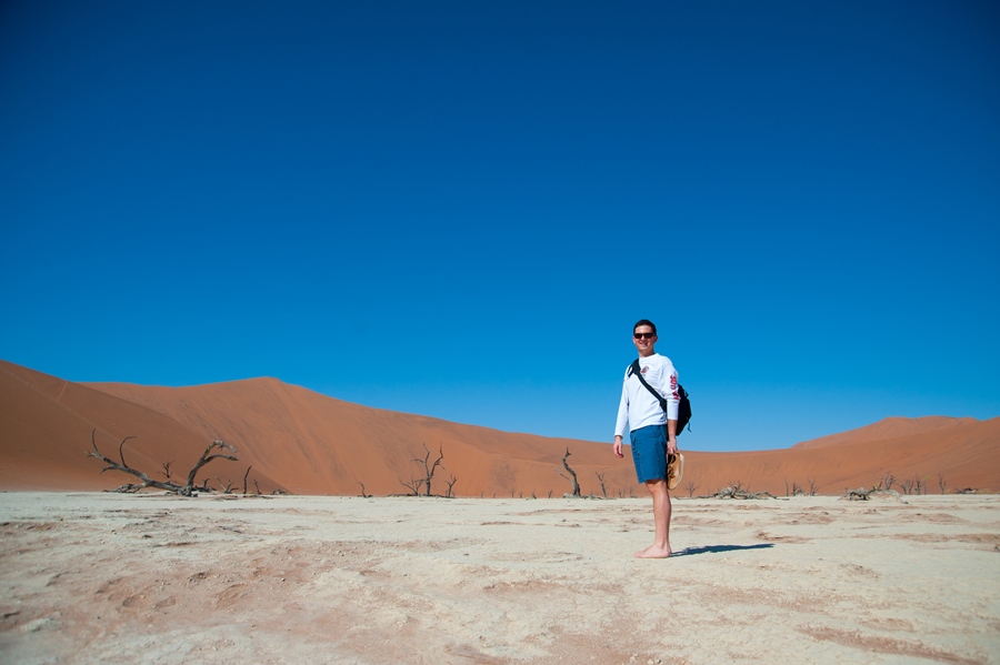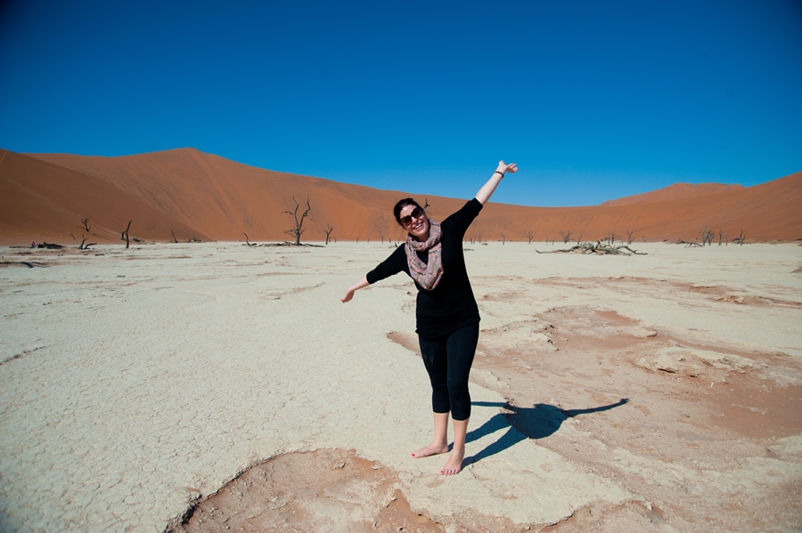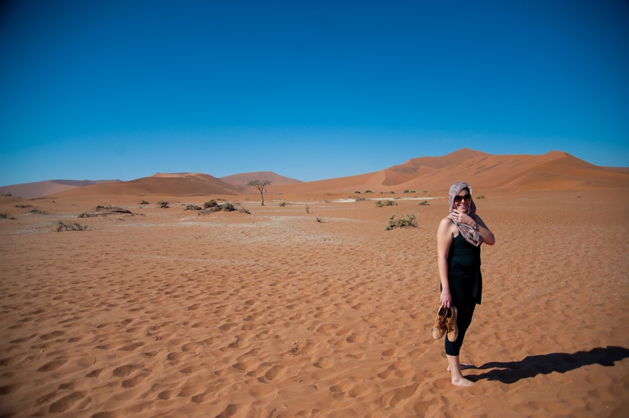 Once we parked under which was probably the thinnest tree in the whole area, Charmaine and I decided to do the 1.5km walk to the dead lake. Coming from a chilly Western Cape, the 30+ degrees was something to get accustomed to. The side of the dunes facing the sun were super-hot and our feet burned as we walked across them. I felt like one of those desert lizards that jump from foot to foot trying not to become semi grilled. There were hundreds of tourists, dressed to the T in their safari outfits, complete with vellies and khakis, worth a chuckle, although we probably looked a bit odd in our shorts and T’s.